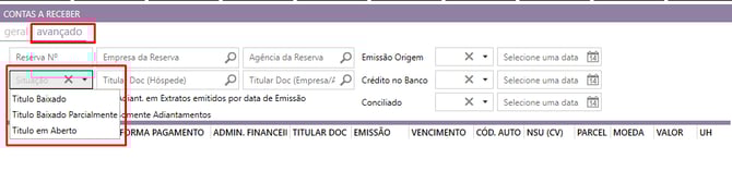 Caso queira aplicar filtro da situação da conta, basta clicar em Avançado → Situação