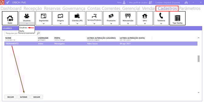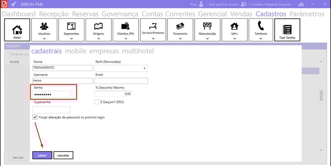 Módulo PMS→ Cadastros → Usuários → Usuários → Abra o usuário desejado clicando em alterar → No campo SENHA altere para a senha desejada e selecione a opção para forçar a alteração de senha.