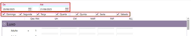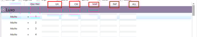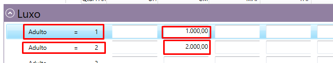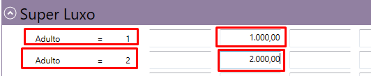 Método por UH: Deve Cadastrar o valor que será cobrado, total, na UH em cada campo de pax. Por exemplo, se na minha categoria Luxo eu cobro por UH, no exemplo abaixo significa que, se tiver 1 adulto no quarto a diária será R$1.000,00 e se tiver 2 adultos, será R$2.000,00