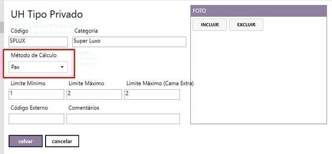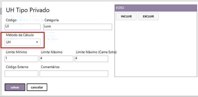 Para cadastrar o valor, deve se atentar, também no tipo de calculo de cada categoria de UH, isso você pode conferir em PMS → Cadastros → UH's → Categoria de UH → Selecione a Categoria →