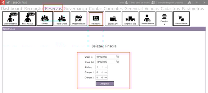 PMS → Reservas → Flash Sales → Selecione o período e quantidade de pax → Pesquisar.