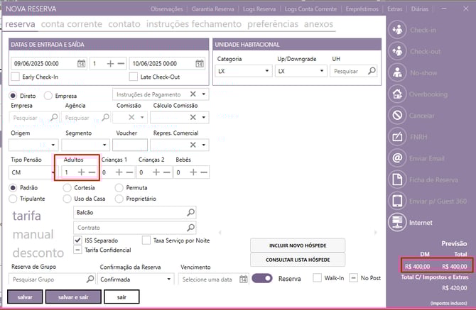 Clicando em reservar, o sistema abrirá a página para a criação da reserva já com a quantidade de pax e valores: