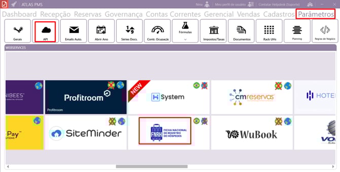 Para ativar a integração, vá em PMS → Parâmetros → API → FNRH Digital.