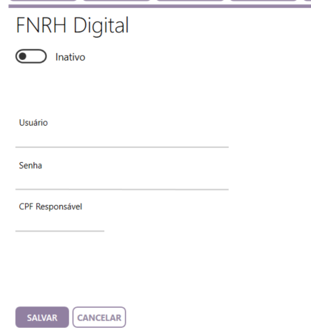 Nesta tela, deve inserir a chave API, Senha e CPF do responsável, esses dados são obtidos no MTur, após o preenchimento, vire a chave de inativo para ativo.
