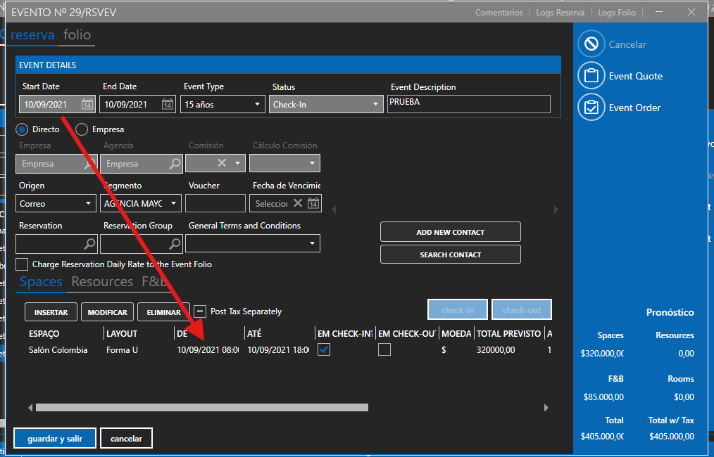 1.Para realizar el check-in en espacios es necesario que la fecha del módulo de eventos sea exactamente la fecha de los espacios como se muestra en la figura a continuación.