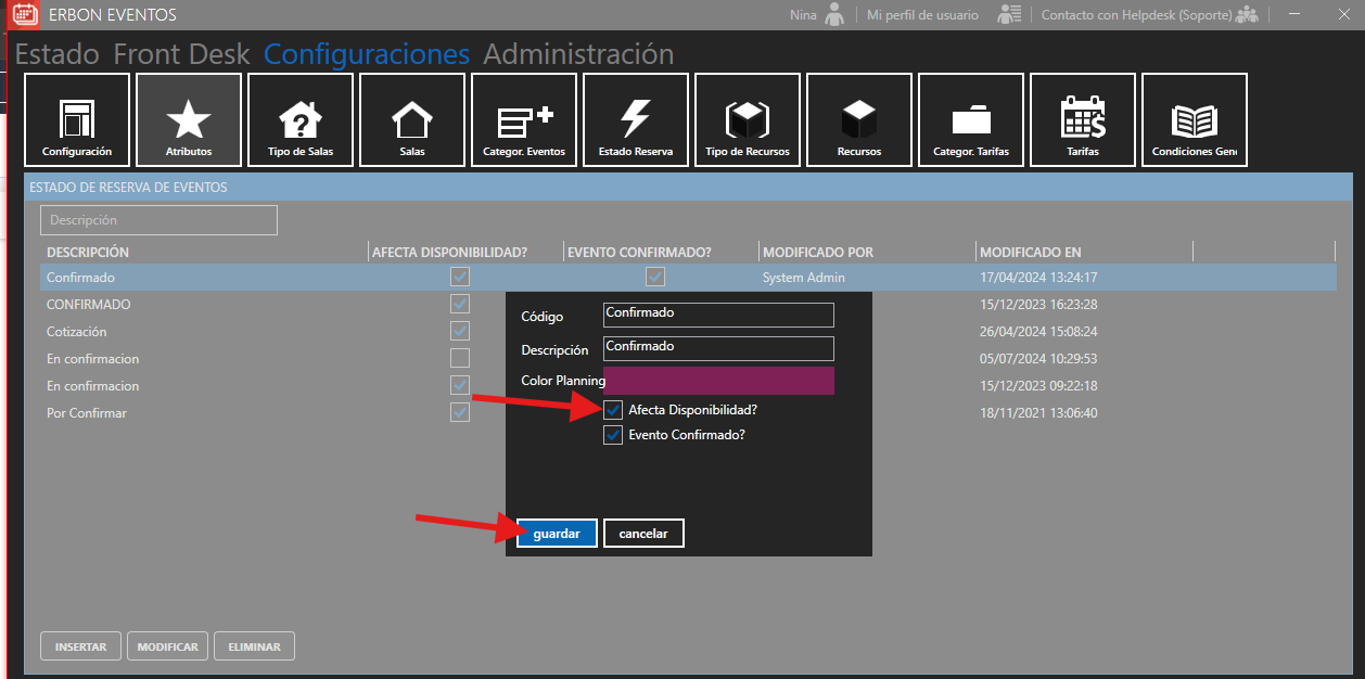 En la pestaña Configuración, submenú Estado Reserva, seleccione las opciones: ¿Afecta Disponibilidad? y Evento Conformado? Luego haga clic en Insertar como se muestra a continuación.