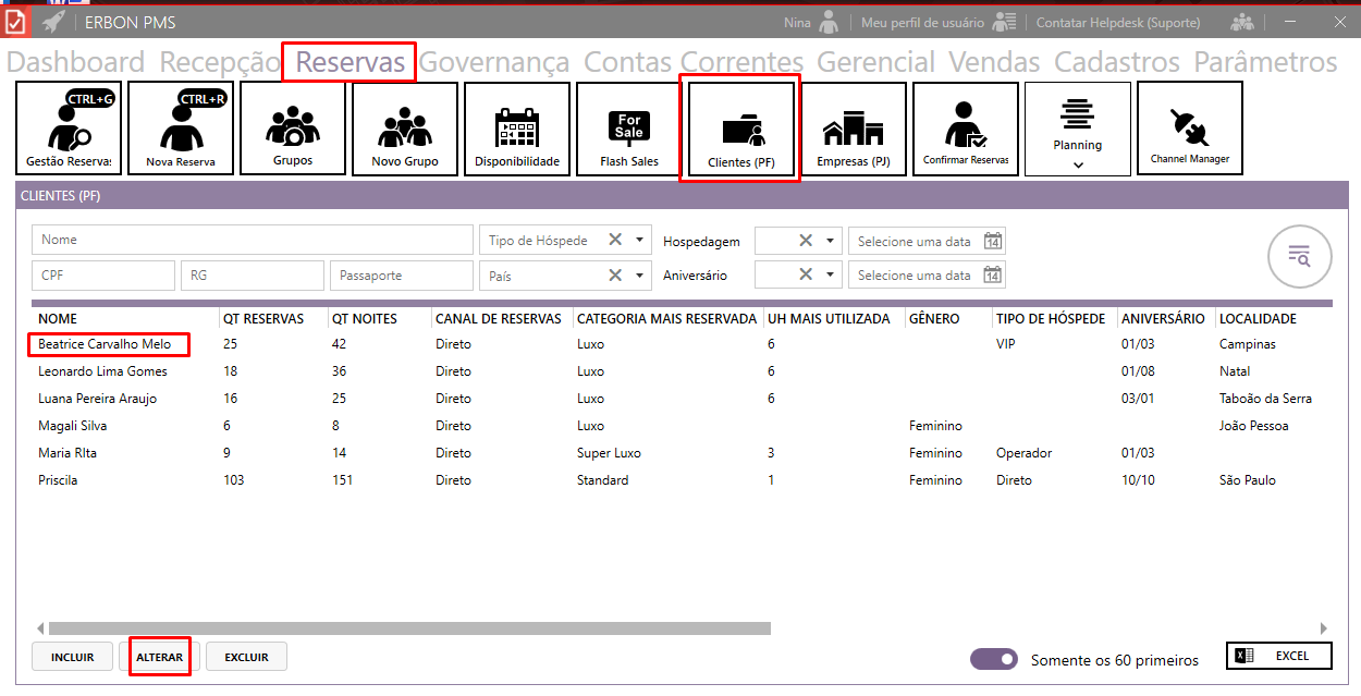 PMS → Reservas → Clientes (PF) → Selecione o hóspede → Alterar.