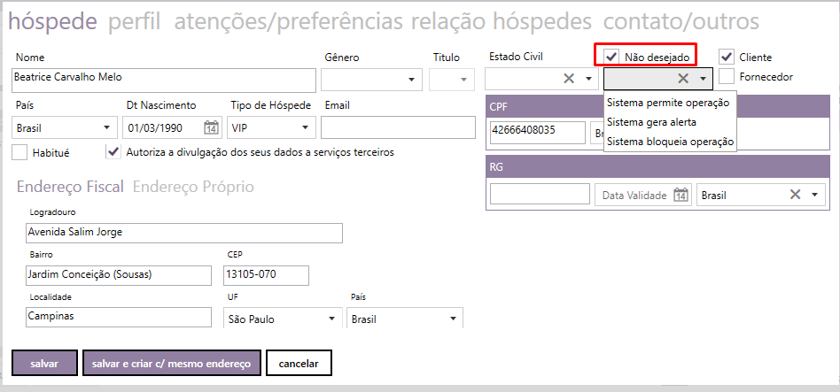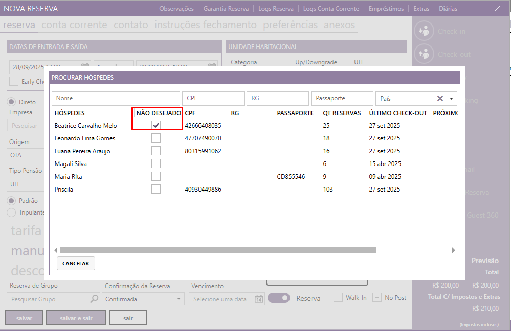 Aqui o sistema permitirá a criação de uma nova reserva, não gerará nenhum alerta, mas ficará a informação de não desejado no momento de vincular o hóspede.