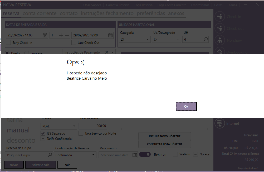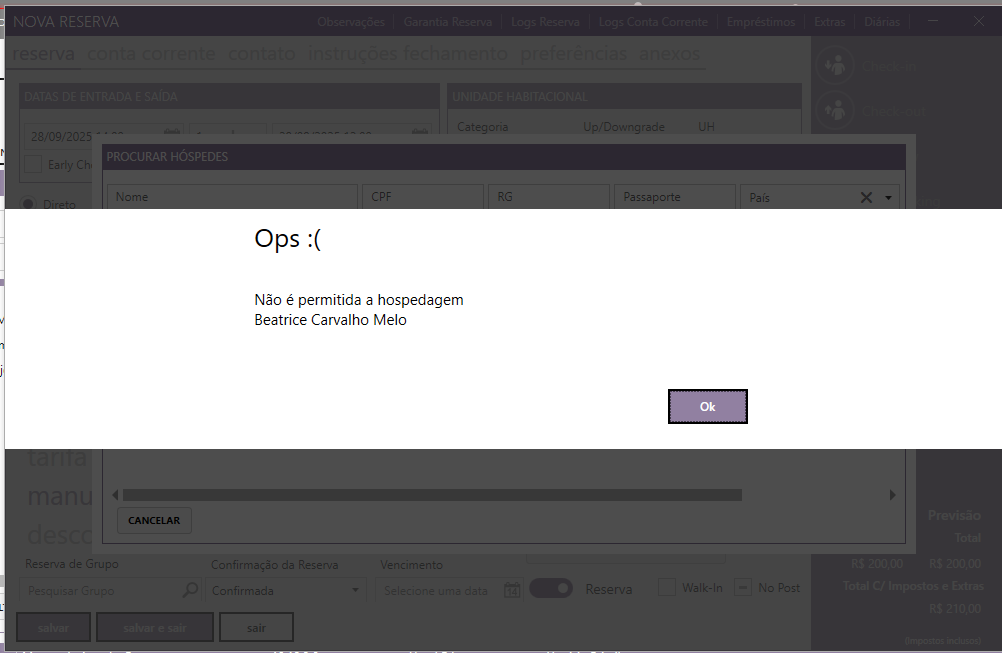 Neste caso, não será permitido criar uma reserva com esse hóspede vinculado a reserva. O sistema, além de alertar, não permite a criação da reserva.