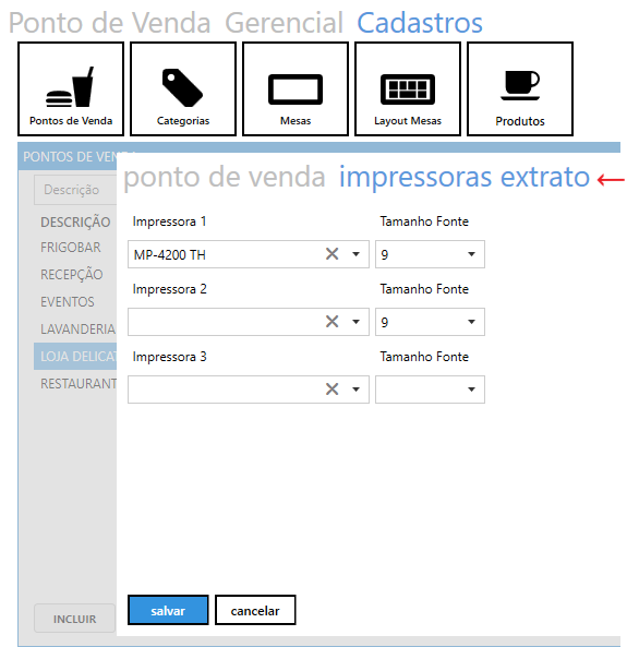 Módulo PDV → Cadastros → Pontos de Venda → Escolha o ponto de venda → Impressoras extrato.
