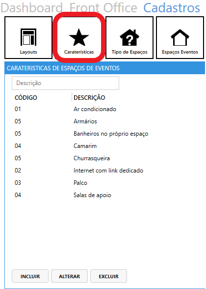 É possível cadastrar todas as características da sua sala de eventos, as características são pontos que não são comercializadas, por exemplo: Ar condicionado, Mesa, Infraestrutura para TV, etc.. No momento da criação do evento, é possível associar as características a cada espaço de evento.