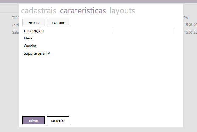 Incluir as características do espaço, que são os itens que pertencem a sala.