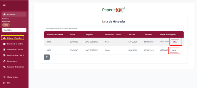 No menu lista de hóspedes terão acesso a todas as reservas com check-in na data atual.