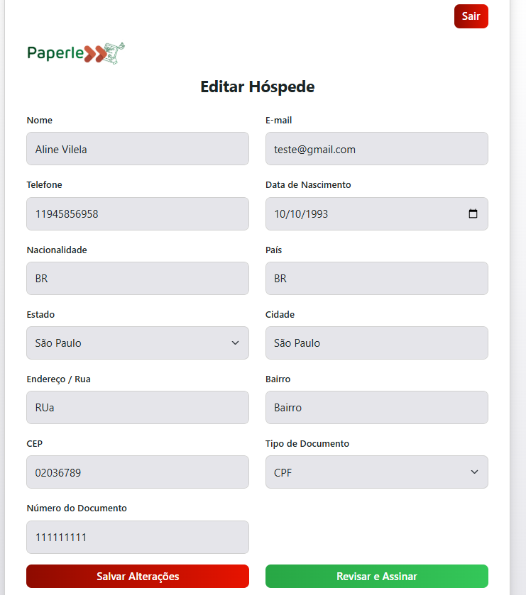 Abrirá a tela com todos os dados do hóspede a serem preenchidos de acordo com o informado por ele, após todo o preenchimento, selecione a opção Revisar e Assinar.