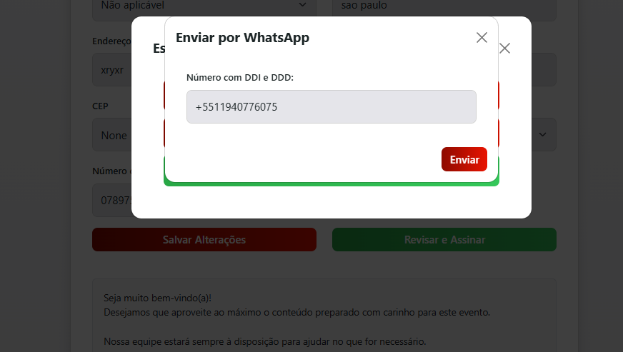 - Enviar por whatsapp. Ao preencher o numero do hóspede, será encaminhado para o whatsapp conectado no navegador, para enviar ao hóspede. Será enviado um link com o campo para assinatura.