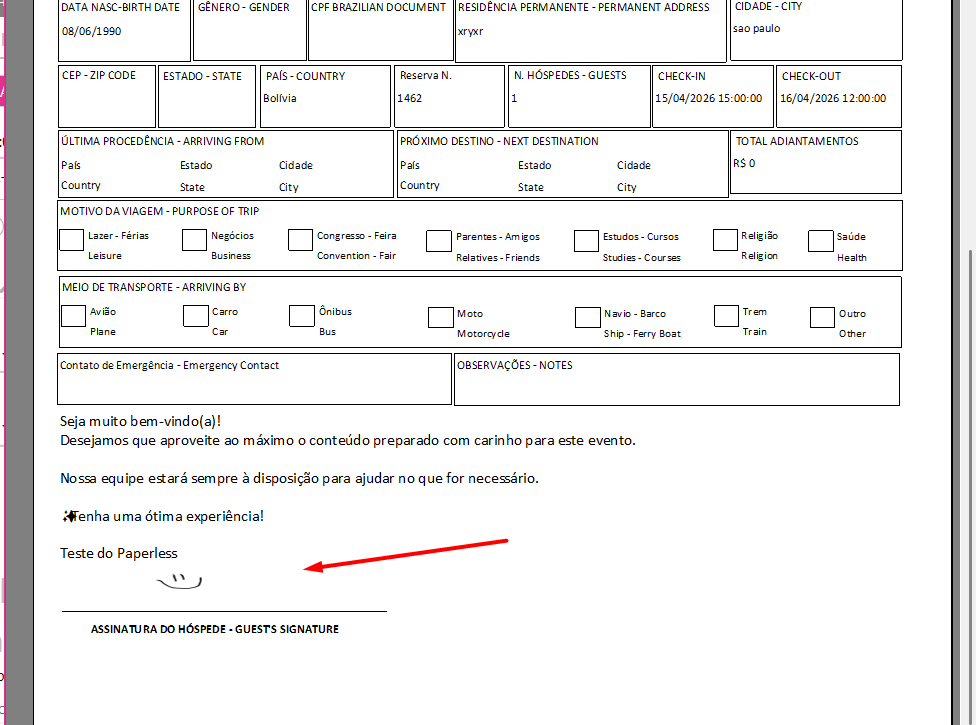 Após o hóspede assinar e finalizar, na fnrh dentro do PMS Atlas, constará a assinatura do hóspede.
