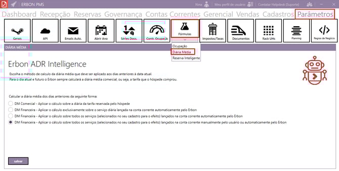 Hoje vamos aprender mais sobre a configuração para calculo de diária média do seu hotel. Para chegar na tela vá em módulo PMS → Parâmetros → Fórmulas → Diária Média.