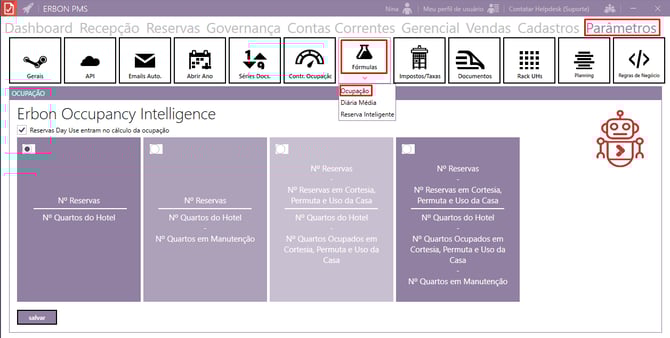 Hoje vamos aprender mais sobre a configuração para calculo de ocupação do seu hotel. Para chegar na tela vá em módulo PMS → Parâmetros → Fórmulas → Ocupação.
