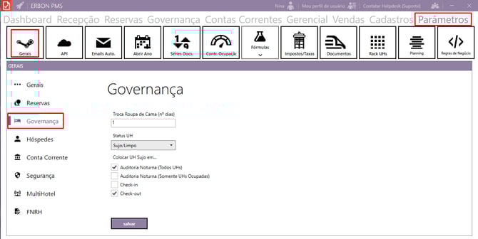 Hoje vamos aprender mais sobre a aba gerais/governança de parâmetros no PMS. Para chegar na tela vá em módulo PMS → Parâmetros → Gerais → Governança.