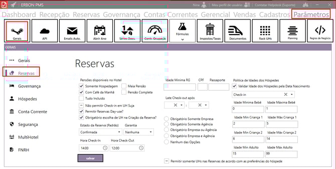 Hoje vamos aprender mais sobre a aba gerais/reservas de parâmetros no PMS. Para chegar na tela vá em módulo PMS → Parâmetros → Gerais → Reservas.