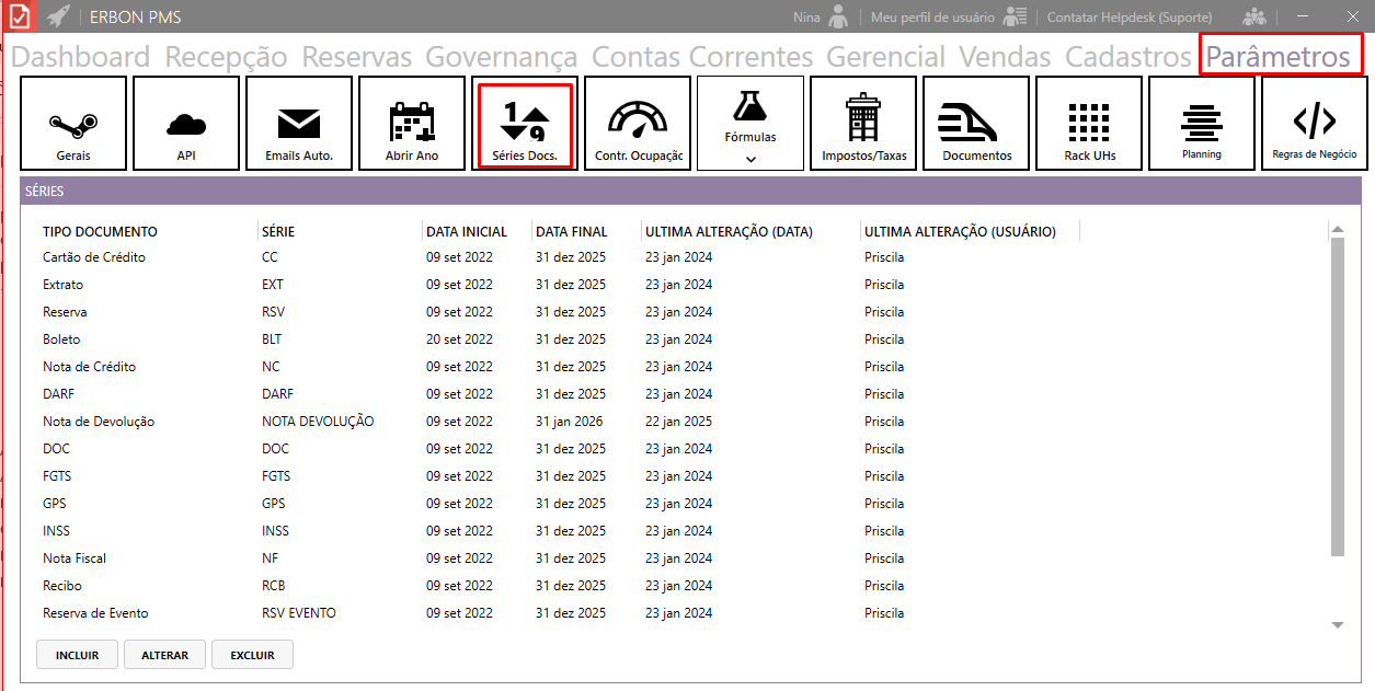 Neste campo é onde devem cadastrar todos os tipos de documentos/séries que usam no hotel e definis a validade de cada documento. Ou seja, até quando usarão o tipo de documento Carta Crédito?