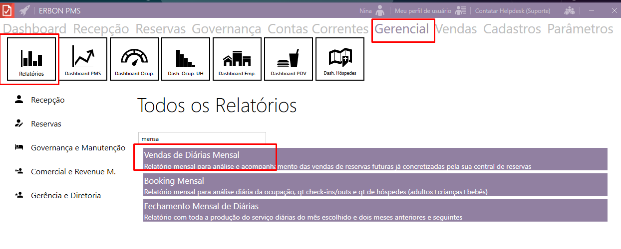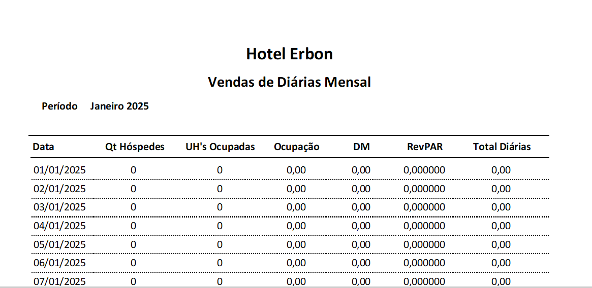 Módulo PMS → Gerencial → Relatórios → Venda de Diárias Mensal → Filtre.