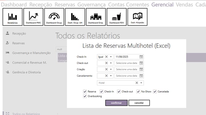 Módulo PMS → Gerencial → Relatórios → Lista de reservas Multihotel → Aplique o filtro desejado.