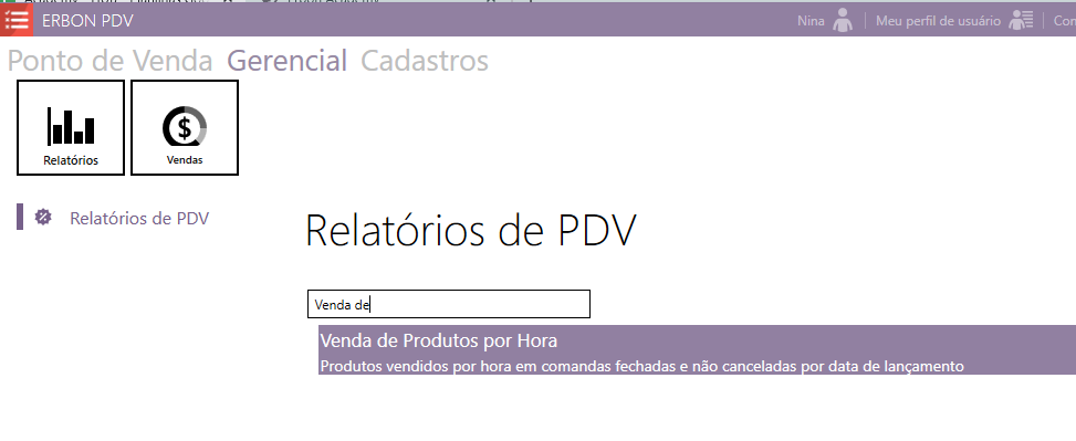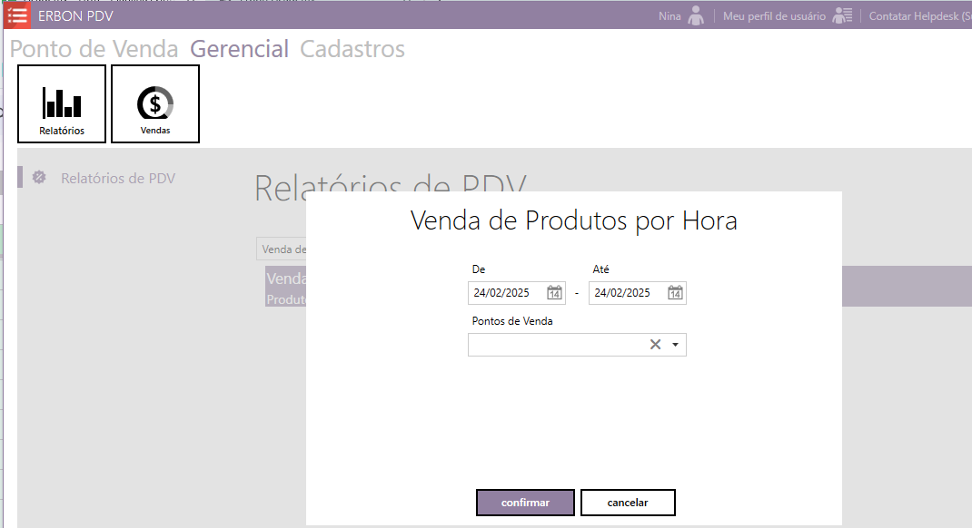 Módulo PDV → Gerencial → Relatórios → Venda de Produtos por Hora → Escolha o período e o ponto de venda