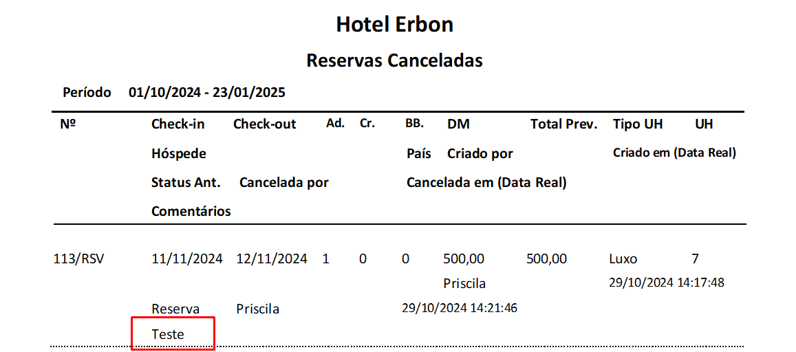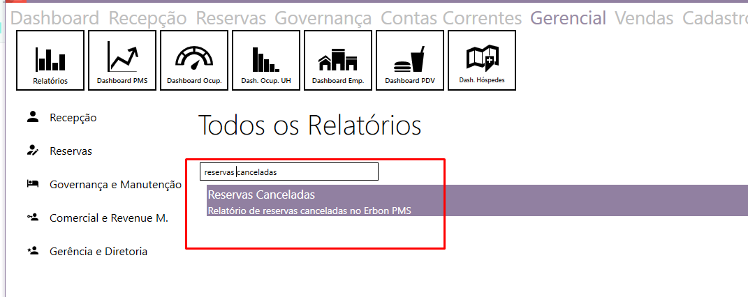 O relatório trará o controle de reservas canceladas no Erbon PMS.