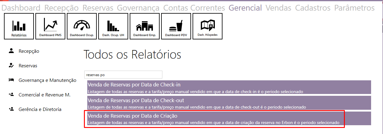 Módulo PMS → Gerencial → Relatórios → Venda de Reservas por data de criação → Filtre.