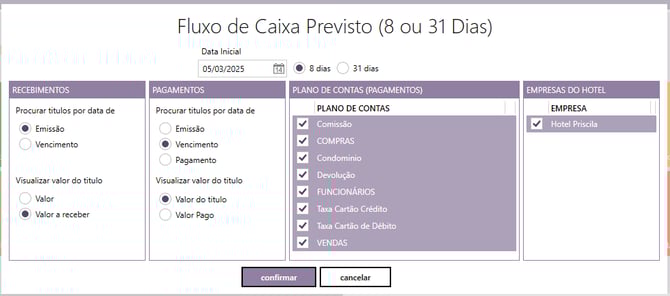 Módulo Financeiro → Gerencial → Relatórios → Fluxo de Caixa Previsto.