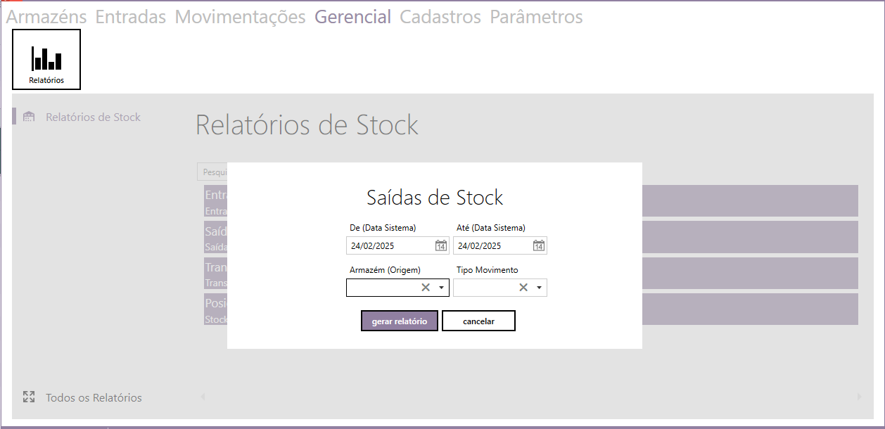 Para obter o relatório das Saídas do Stock, siga o passo a passo: