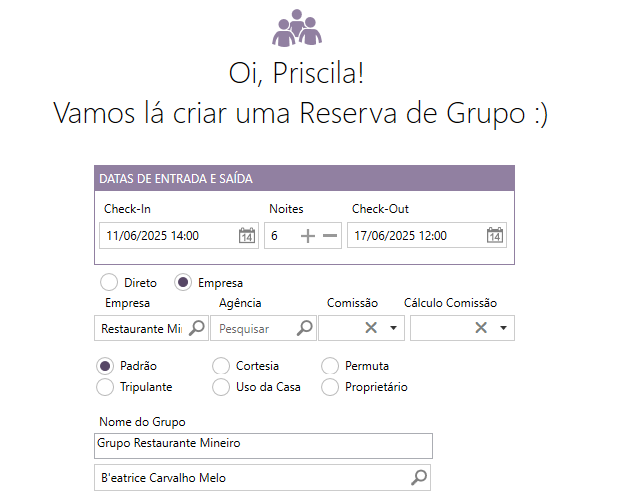Prontinho, agora você tem uma reserva de grupo criada! Agora, precisamos cadastrar o nome dos hóspedes nas reservas.