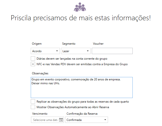 - Observações - Caso necessário, insira as observações do grupo e escolha se essa observação será replicada a todas as reservas ou não e se as observações apareceram automaticamente quando abrir uma das reservas.