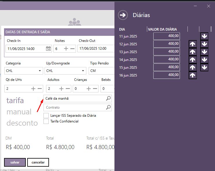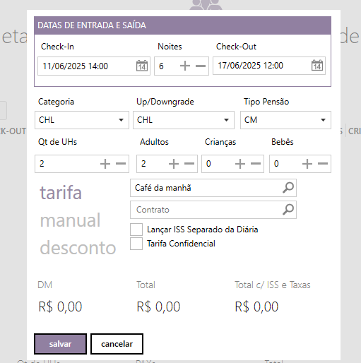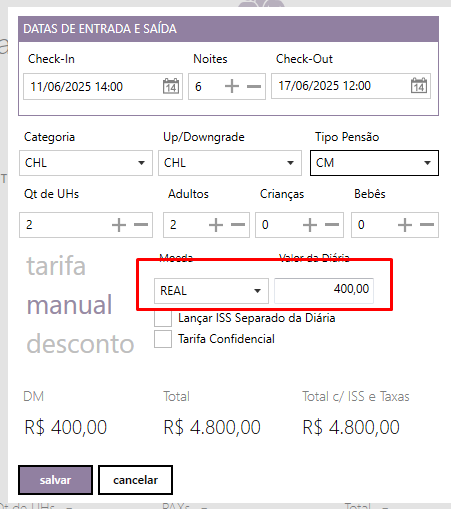 Caso selecione a opção de TARIFA e esse for para cadastro de tarifa na reserva, aparecerá a tela abaixo, basta cadastrar o valor da diária para essas reservas.