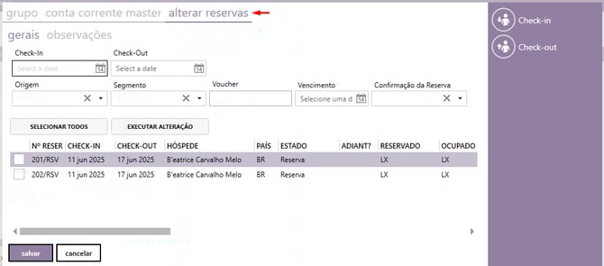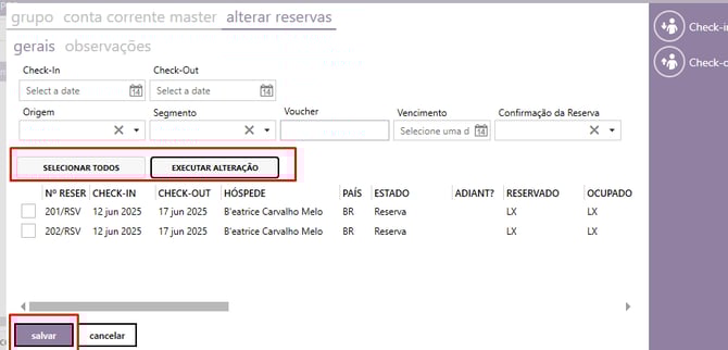 Neste campo, também é possível alterar algumas informações de forma simultâneas, como a data de check-in e out, origem, segmento. Para isso, basta preencher as informações a serem alteradas, selecione as reservas que devem sofrer as alterações → Executar Alteração → Salvar.