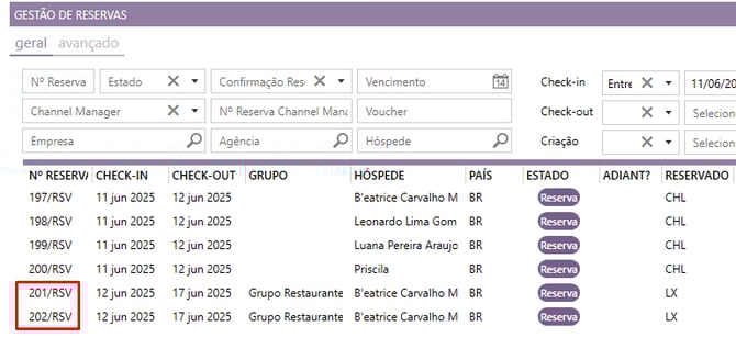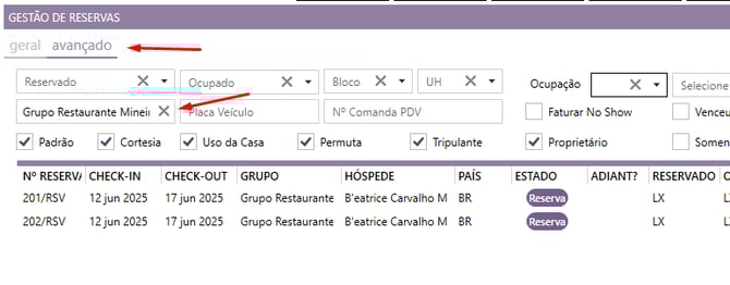 Em gestão de reservas você consegue achar a reserva individualmente, ou então filtrar pelo grupo.