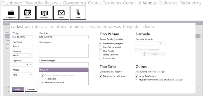 Módulo PMS → Vendas → Tarifas → Selecione o tarifário → Alterar