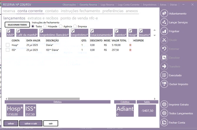 Por que isso? Quando a Omnibees nos enviar essa reserva, não estará separado e discriminado a taxa. Será integrado o valor da diária, somente. Com essa configuração, o sistema Erbon dividirá o valor entre Diária + Taxa, constando na conta corrente do hóspede o que é diária e o que é taxa. Exemplo dentro do lançamento automático na conta corrente de uma reserva.