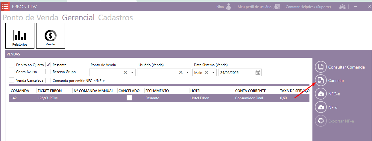 Atenção: O botão cancelar fica disponível somente para vendas de passantes. Se foi fechamento com débito ao quarto, deverá acessar a conta corrente da reserva e estornar os produtos.